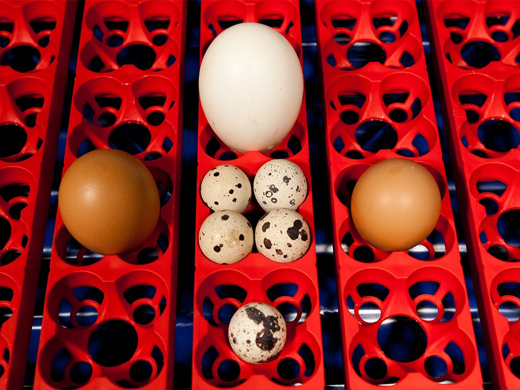 Kapacita s otočným roštom: 56 slepačích, 224 prepeličích, 56 husacích, 56 kačacích alebo 56 bažantích vajec.