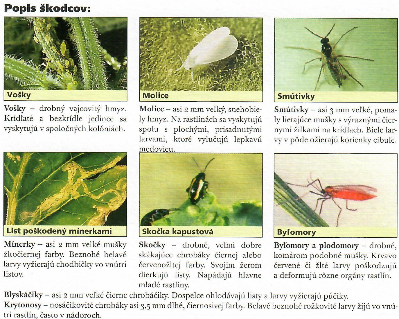 - zisťovanie škodcov : vošky, molice, smútivky, mínerky, skočky, bybyľomor, plodomor, bliskáčiky, krytonos kapustový