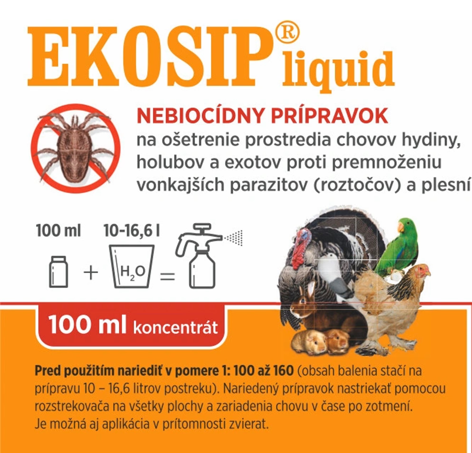Ekosip liquid je nebiocídny prípravok určený na ošetrenie prostredia chovov hydiny, holubov a exotického vtáctva. Pomáha predchádzať premnoženiu roztočov a plesní bez rizika reziduí vo vajíčkach alebo mäse.