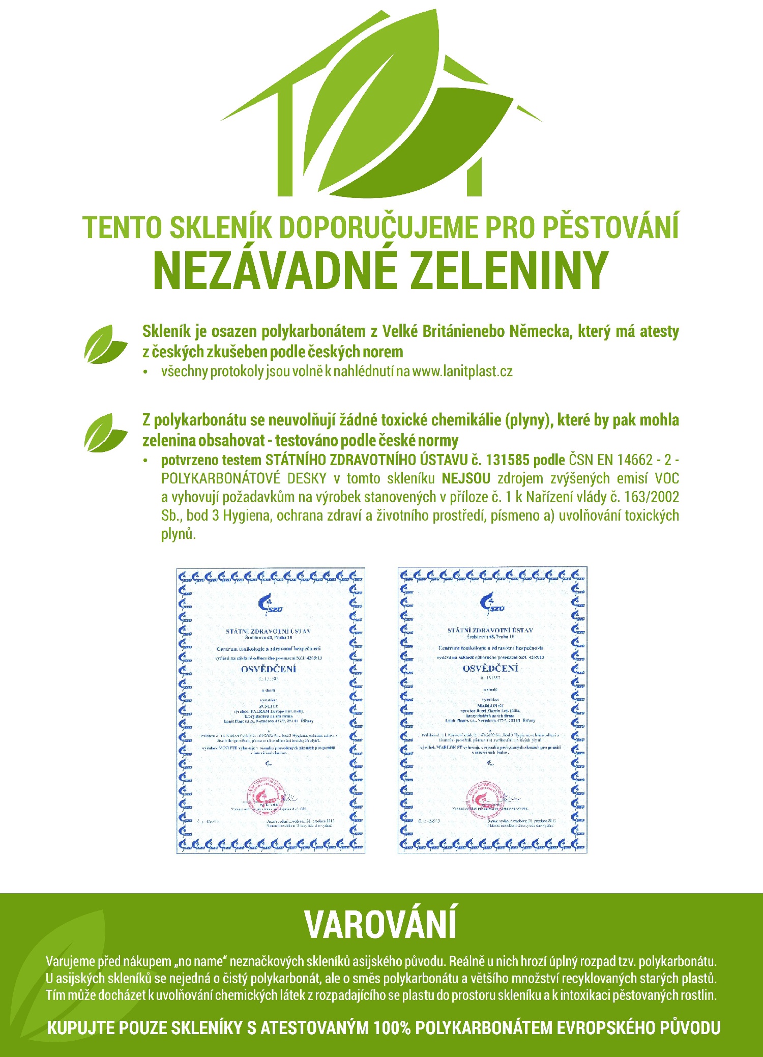 Skleník je vyhotovený z veľmi kvalitného dvojstenného polykarbonátu so silným UV filtrom (nekrehne, nežltne). Z dôvodu zaistenia maximálnej kvality je presklenie vyrobené zo špičkového polykarbonátu MARLON (výrobca Brett Martin Veľká Británia) alebo SUNLITE (výrobca Palram Nemecko).