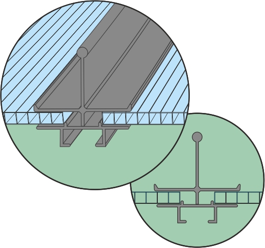 Polykarbonátové presklenie je do hliníkových H-profilov zasunuté po obvode s výnimkou krajných polí a čela skleníka, kde je presklenie zaistené pevnou polykarbonátovou lištou. Jedná sa o veľmi kvalitné riešenie, ktoré významne zvyšuje celkovú pevnosť a stabilitu celého skleníka voči vetru a aj snehovému zaťaženiu.