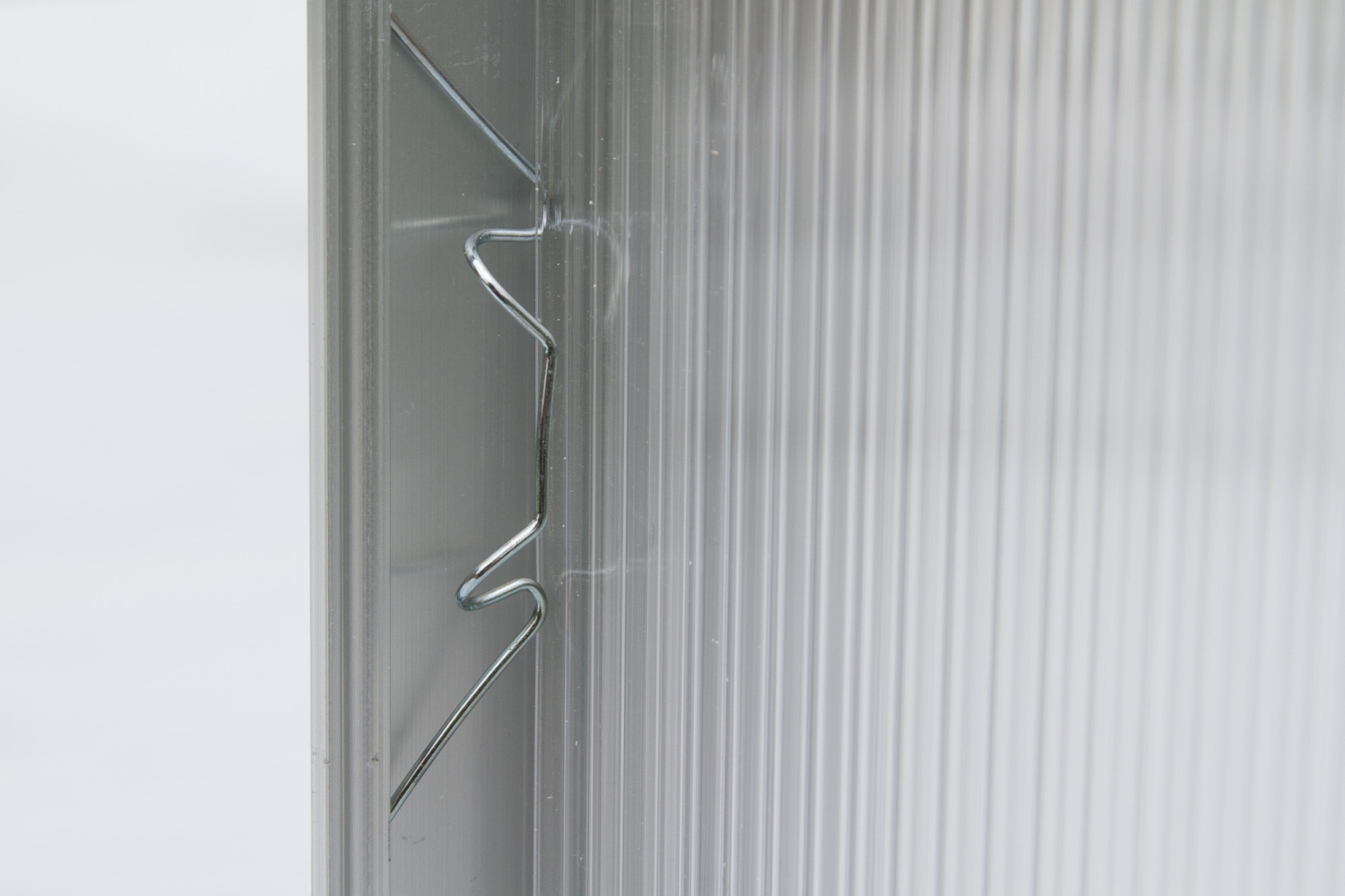 Skleník je vyhotovený z eloxovaných hliníkových profilov a dodávaný s presklením z tepelno-izolačných komôrkových polykarbonátových dosiek s hrúbkou 6 mm (koeficient prestupu tepla K= 3,70 W/m2K (sklo 4 mm iba 5,80 W/m2K) => čím menšie číslo, tým väčšia tepelná izolácia).