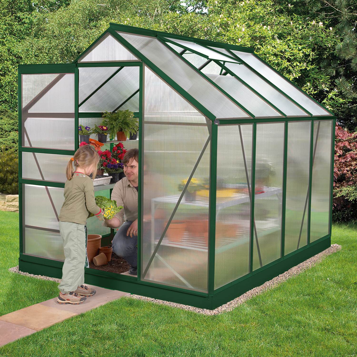 Hliníkový skleník, (Š x D) 195 x 257 cm, farba zelená, 1x strešné vetracie okno, polykarbonát 6 mm, plocha 4,96 m2.