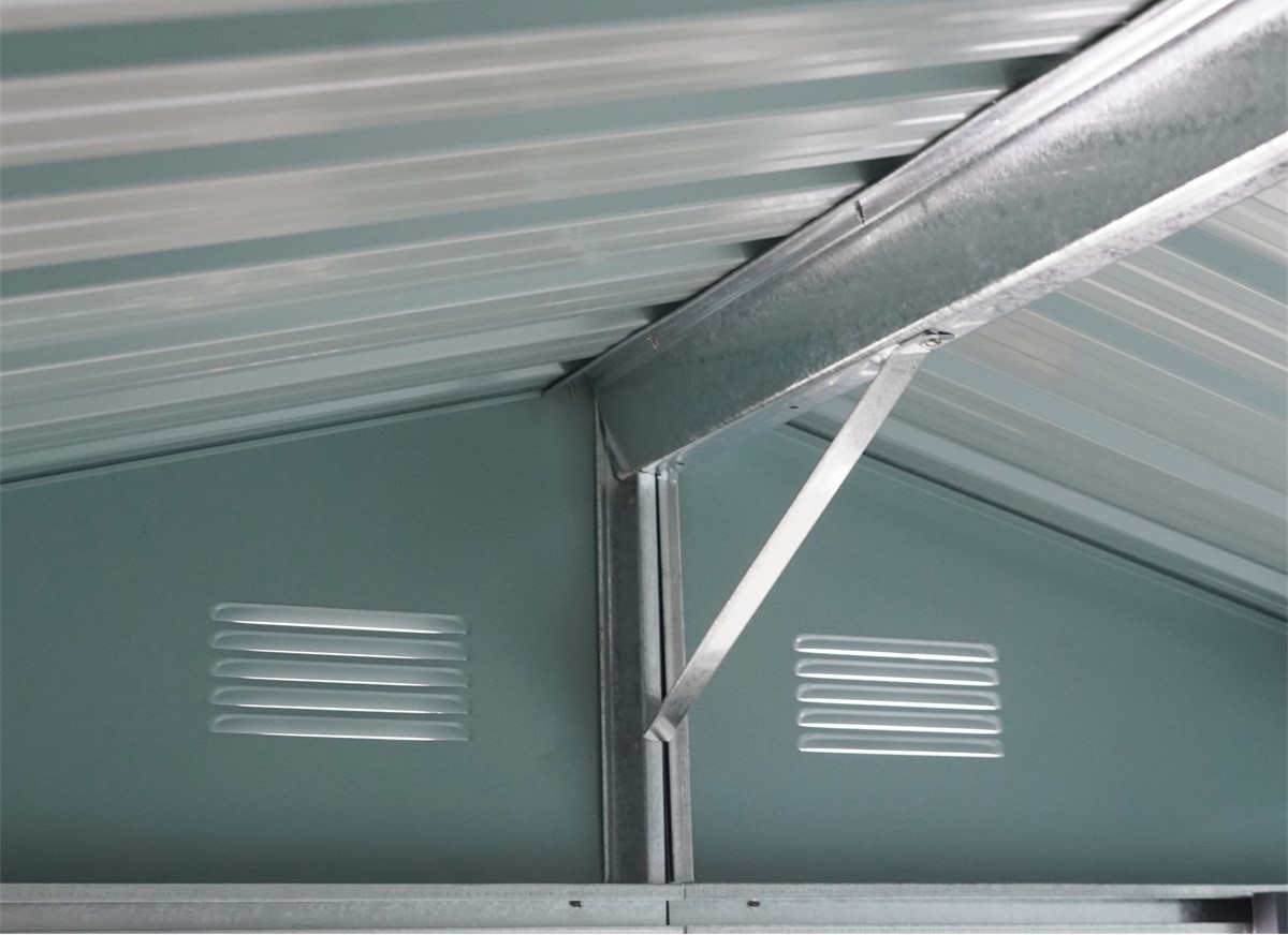 Domček je vyrobený z profilovaných oceľových plechov s antikoróznou úpravou. Rám aj steny sú žiarovo zinkované a následne ošetrené kvalitným práškovým lakom, ktorý zaisťuje dlhú životnosť. Výstuhy v stenách a streche zabezpečujú vyššiu pevnosť a odolnosť voči vetru či snehu.